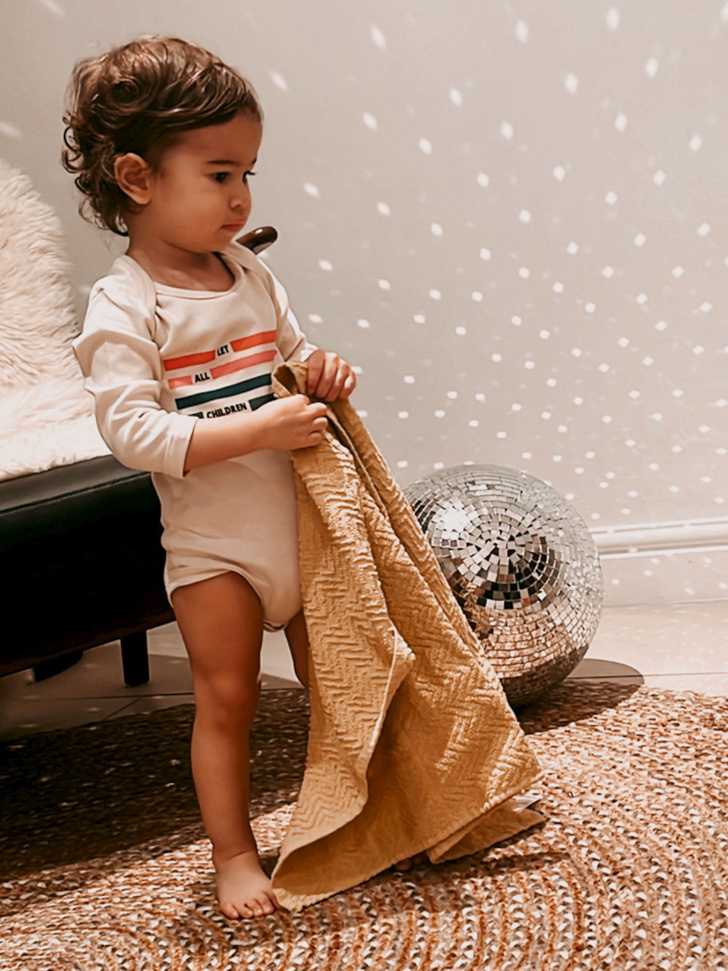 For the Bowie fans, add some retro soul to a kiddos style with our Let all the Children Boogie ecru long sleeved bodysuit, made from 100% organic cotton. Inspired by the oh so popular 70s hit Starman by David Bowie, this joyful baby grow takes design inspiration from early retro book covers and classic primary colours, the perfect playful piece!