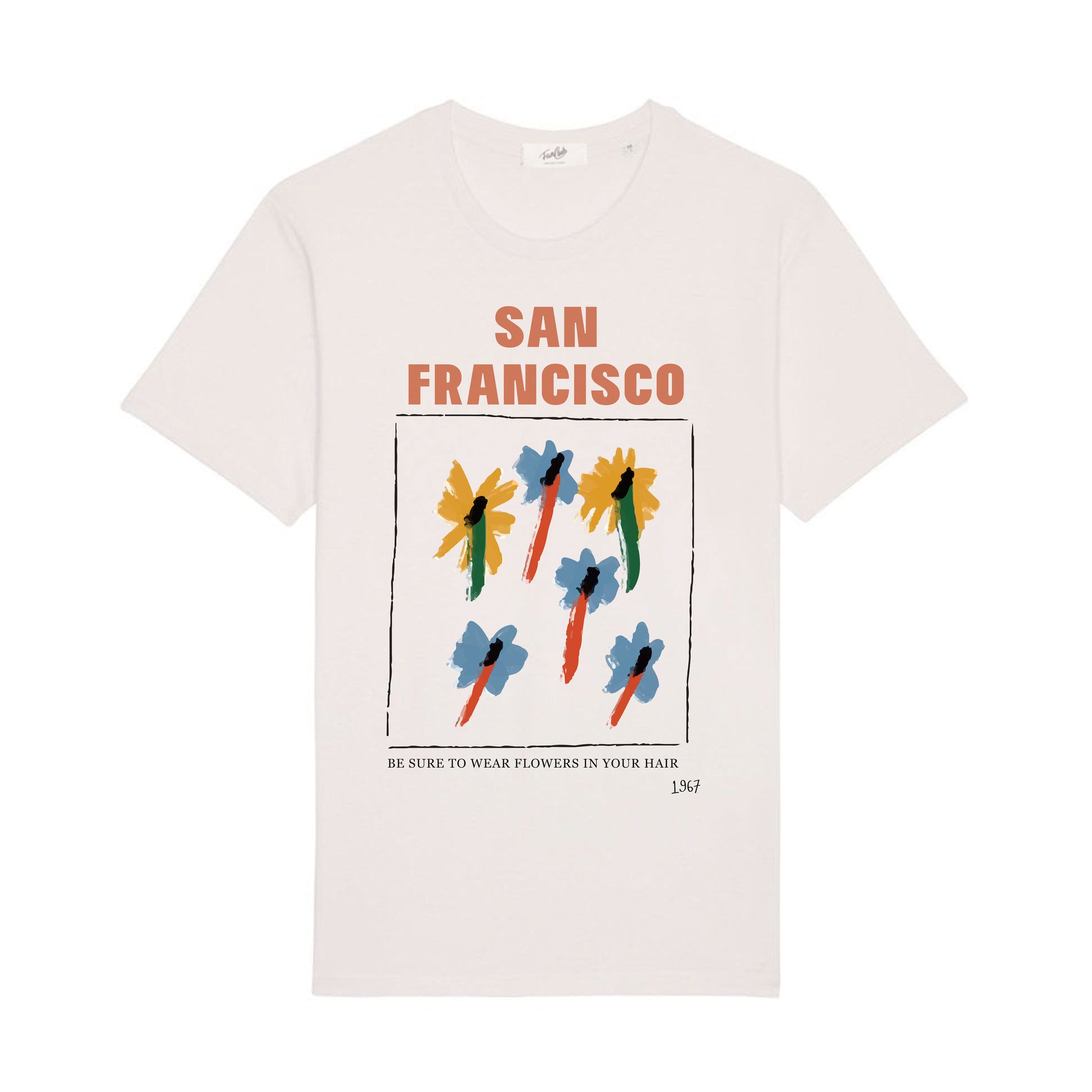 Inspired by the 1960s counterculture and hippie movement, this San Francisco t-shirt is that easy summer throw on. Taking  design hues from abstract watercolours, 60s artists and of course the famous 67 legendary song, San Francisco (Be sure to wear flowers in your hair) Written by John Phillips and sung by Scott Mckenzie. Add some bohemian nostalgic soul to your wardrobe with vintage white tee and abstract flower design.